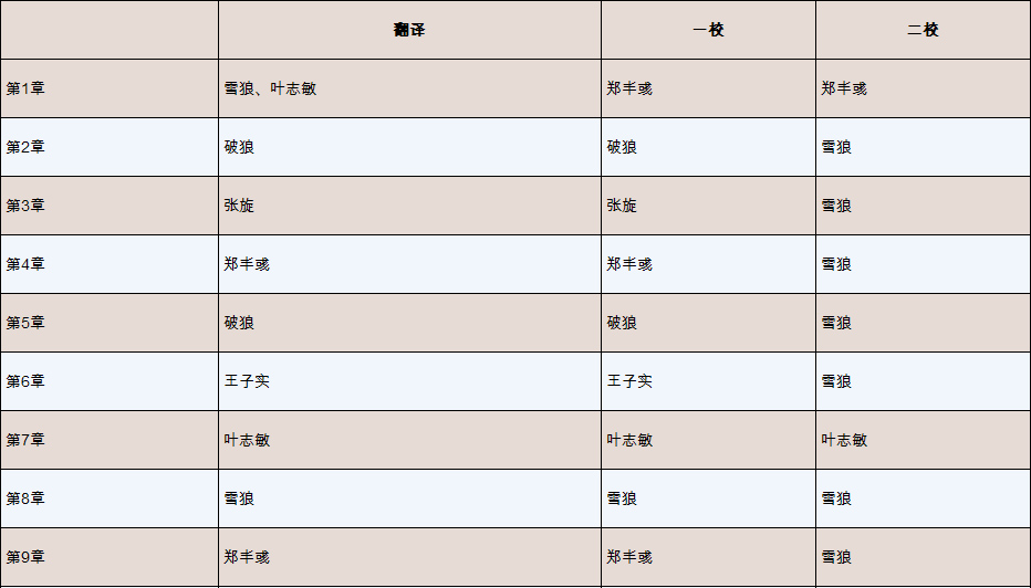 除此之外,雪狼还承担了项目管理和中文统稿工作;破狼负责全书的技术准确性把关;叶志敏负责与作者沟通,并在英文理解方面进行把关。