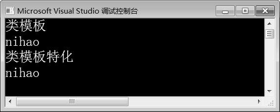 在例6-9中,第4~21行代码定义了类模板Special。第23~43行代码是类模板Special针对const char*数据类型的全特化,其中的第32~39行代码重新定义成员函数com pare()为普通成员函数,实现const char*类字符串的比较。第47~48行代码定义Special<string>类对象s1,并调用com pare()函数比较两个字符串大小;第50~51行代码定义Special<const char*>类对象s2,并调用com pare()函数比较两个字符串大小。由图6-9可知,对象s1调用的是类模板实例化出的com pare()函数,对象s2调用的是全特化之后的com pare()函数。