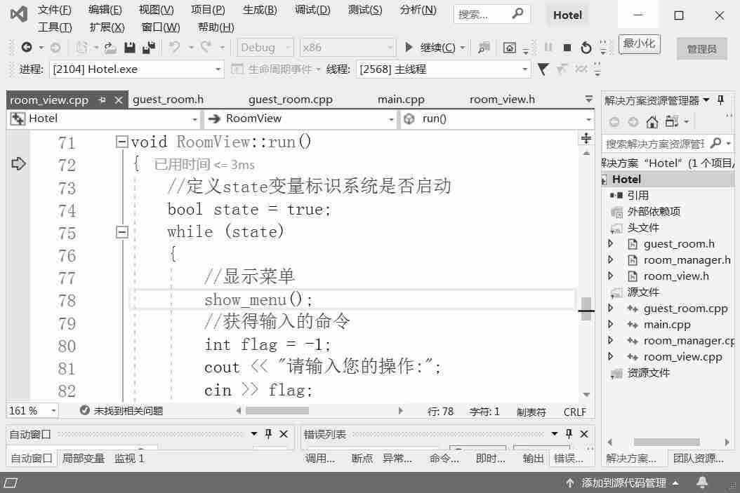 在前面几节中讲解了程序调试的相关知识,为了让读者真实体验实际开发中进行程序调试的全过程,接下来以酒店管理系统为例演示程序调试过程。