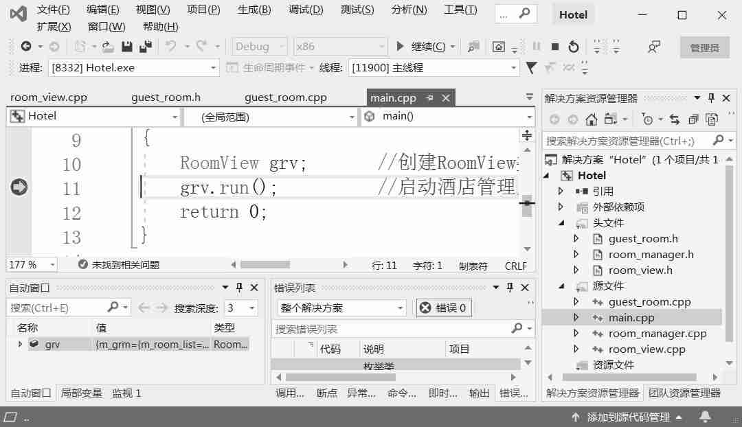在程序开发过程中难免会出现各种各样的错误。为了快速发现和解决程序中的错误,可以使用Visual Studio 2019自带的调试功能,通过程序调试快速定位错误。本节就以酒店管理系统为例对调试功能进行详细的讲解。