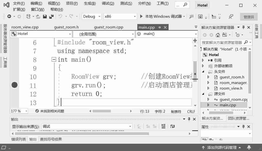 在实际开发中,一个模块通常分两个文件实现,类的定义与数据的设计在.h文件中,而类的实现在对应的.cpp文件中。下面分两个文件实现客房模块:guest_room.h和guest_room.cpp,在guest_room.h文件中定义GuestRoom类,在guest_room.cpp文件中实现GuestRoom类的设计,具体如例11-1和例11-2所示。