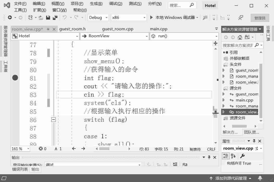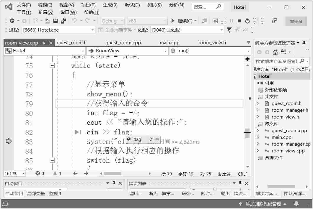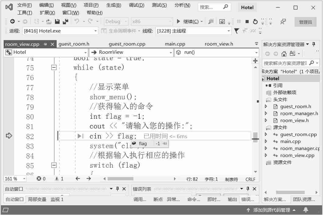 在酒店管理系统的主菜单中,要求输入1~5之间的整数,如果输入不符合要求的数据,如输入一个字符,则系统会一直闪屏无响应。对此进行分析,主菜单的输入操作由界面模块的run()函数实现,在例11-6所示的room_view.cpp文件中,第81~105行代码定义int类型变量flag,利用对象cin从键盘输入flag的值,然后判断flag的值,根据flag的值调用不同的函数以实现不同的操作。