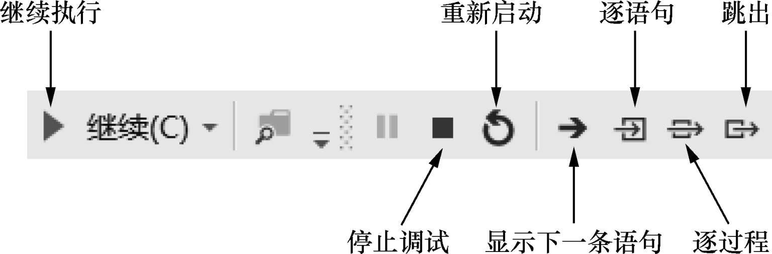 在图11-18中,程序遇到断点会暂停运行,等待用户进行操作。程序暂停运行之后,Visual Studio 2019工具栏按钮会发生变化,如图11-19所示。