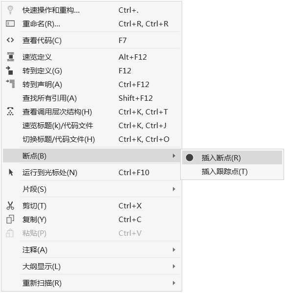 在程序中,将鼠标放置在要插入断点的代码行,单击鼠标右键,依次选择【断点】→【插入断点】,如图11-15所示。