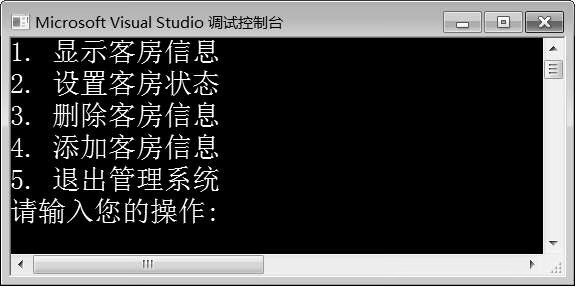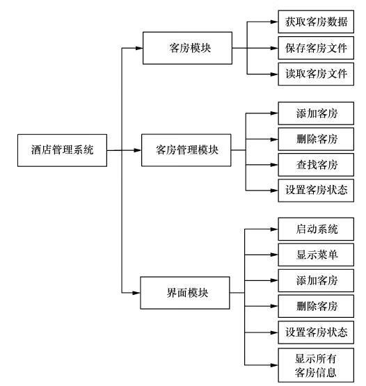 (3)界面模块:主要用于显示酒店管理系统的操作界面。例如,启动系统、显示菜单、添加客房、删除客房、设置客房状态及显示所有客房信息等操作界面。