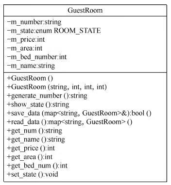 客房管理模块主要负责保存、读取客房数据,如客房编号、名称、价格等,该模块需要设计一个客房类GuestRoom,在该类中定义客房的数据信息作为成员变量,并提供访问这些客房数据的成员函数。此外,GuestRoom类负责将客房数据保存到本地文件中,并在显示客房信息时负责从文件读取客房信息,因此还需要定义文件读写函数。