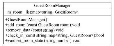 客房管理模块主要负责管理客房,如添加客房、删除客房、查找客房,以及设置客房状态等,该模块需要设计一个客房管理类GuestR oomM anager,在该类中定义各种功能函数。由于管理客房时每次需要从文件中读取客房数据,在设计时可以将读取的客房数据保存到一个m ap容器中,以客房编号为K ey键,以GuestRoom类对象作为Value值。因此,GuestRoomM anager类中还需要定义一个m ap容器作为成员变量存储客房信息。
