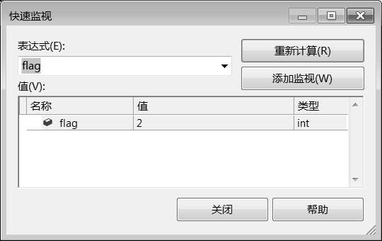 程序调试过程中,在代码区单击鼠标右键选择【快速监视】,弹出“快速监视”窗口,在该窗口的“表达式”文本框中输入要监视的变量,单击【重新计算】按钮,就可以查看变量的名称、值与数据类型,如图11-24所示。
