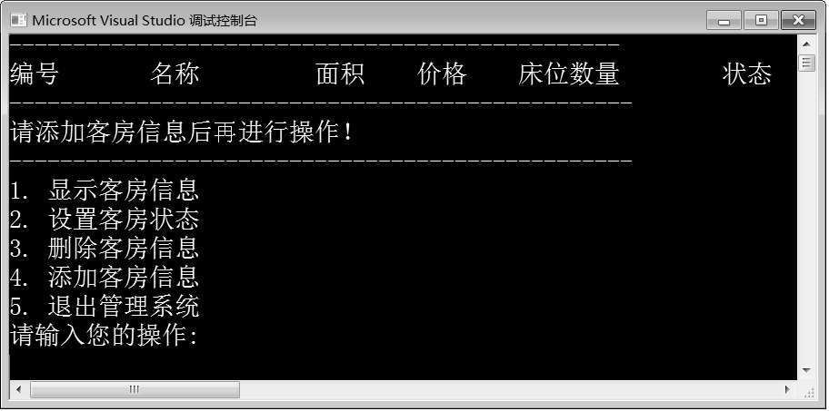 输入数字1,显示客房信息,第一次运行程序时,由于还没有客房,因此显示客房信息时,没有任何信息,系统会提示先添加客房,如图11-7所示。