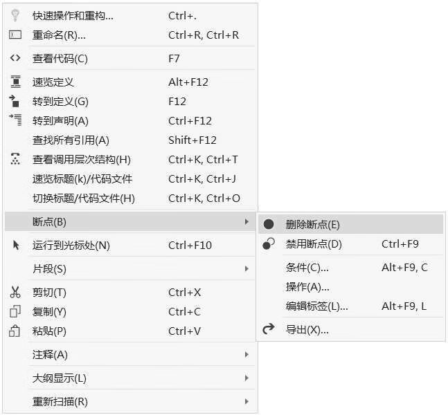 从图11-16得知,第11行代码处添加了一个断点。为程序设置断点以后,就可以对程序进行调试了。调试完毕要删除断点。删除断点的操作也非常简单,将鼠标放置在断点代码行,单击鼠标右键,选择【删除断点】,如图11-17所示。