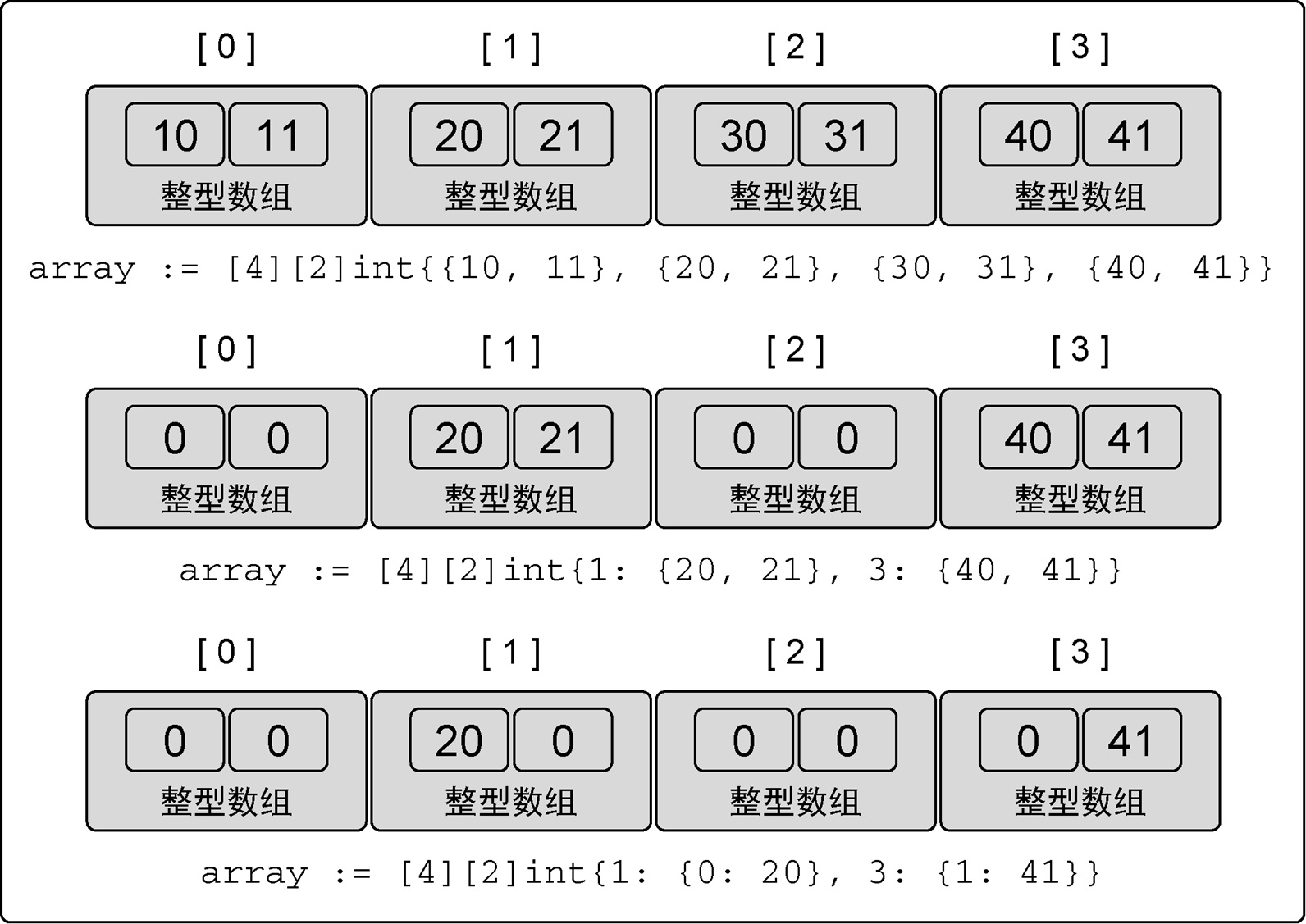 array := [4][2]int{1: {20, 21}, 3: {40, 41}}