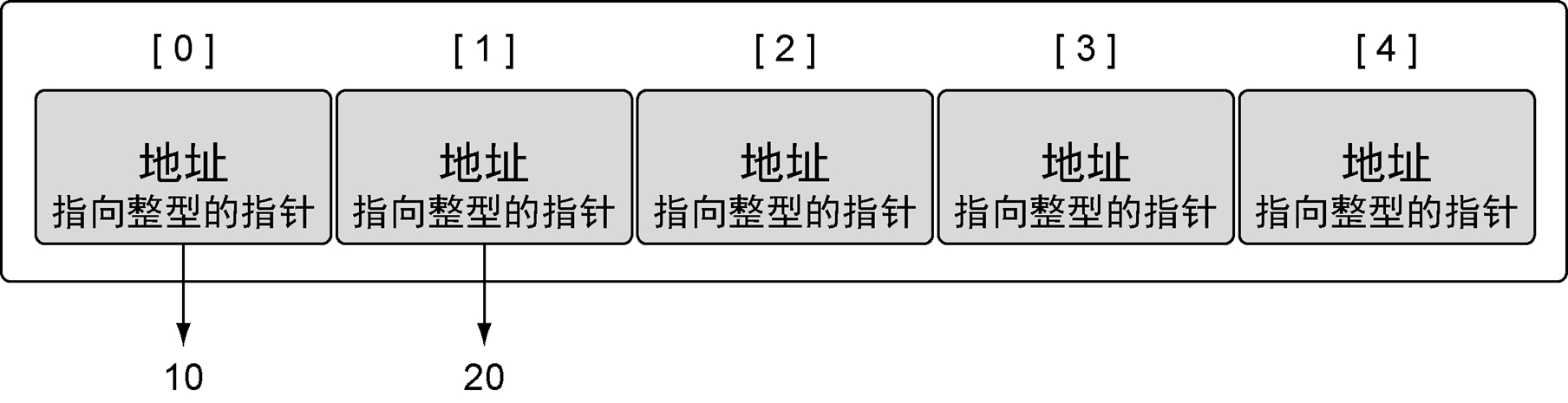 可以像第2章一样,声明一个所有元素都是指针的数组。使用*运算符就可以访问元素指针所指向的值,如代码清单4-6所示。
