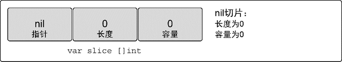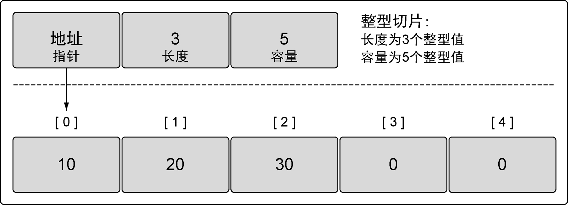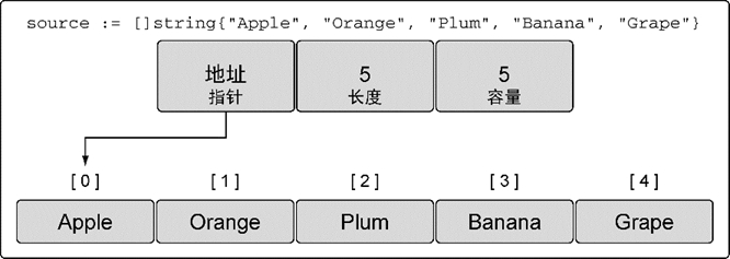 在64位架构的机器上,一个切片需要24字节的内存:指针字段需要8 字节,长度和容量字段分别需要8字节。由于与切片关联的数据包含在底层数组里,不属于切片本身,所以将切片复制到任意函数的时候,对底层数组大小都不会有影响。复制时只会复制切片本身,不会涉及底层数组(见图4-22)。