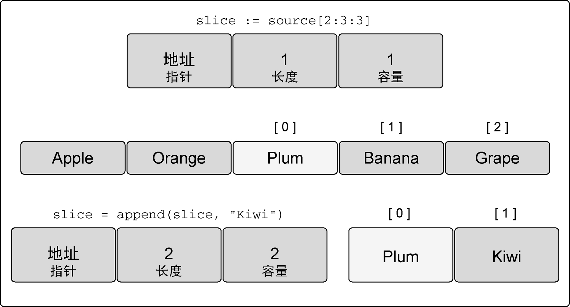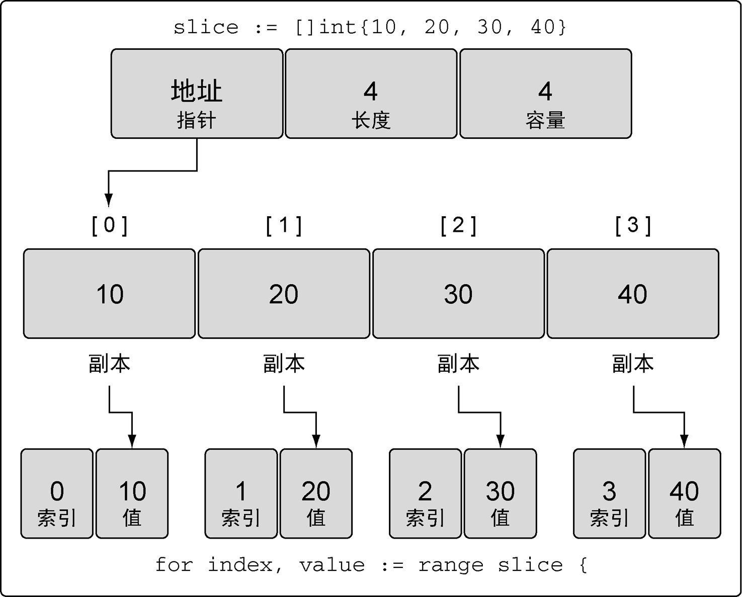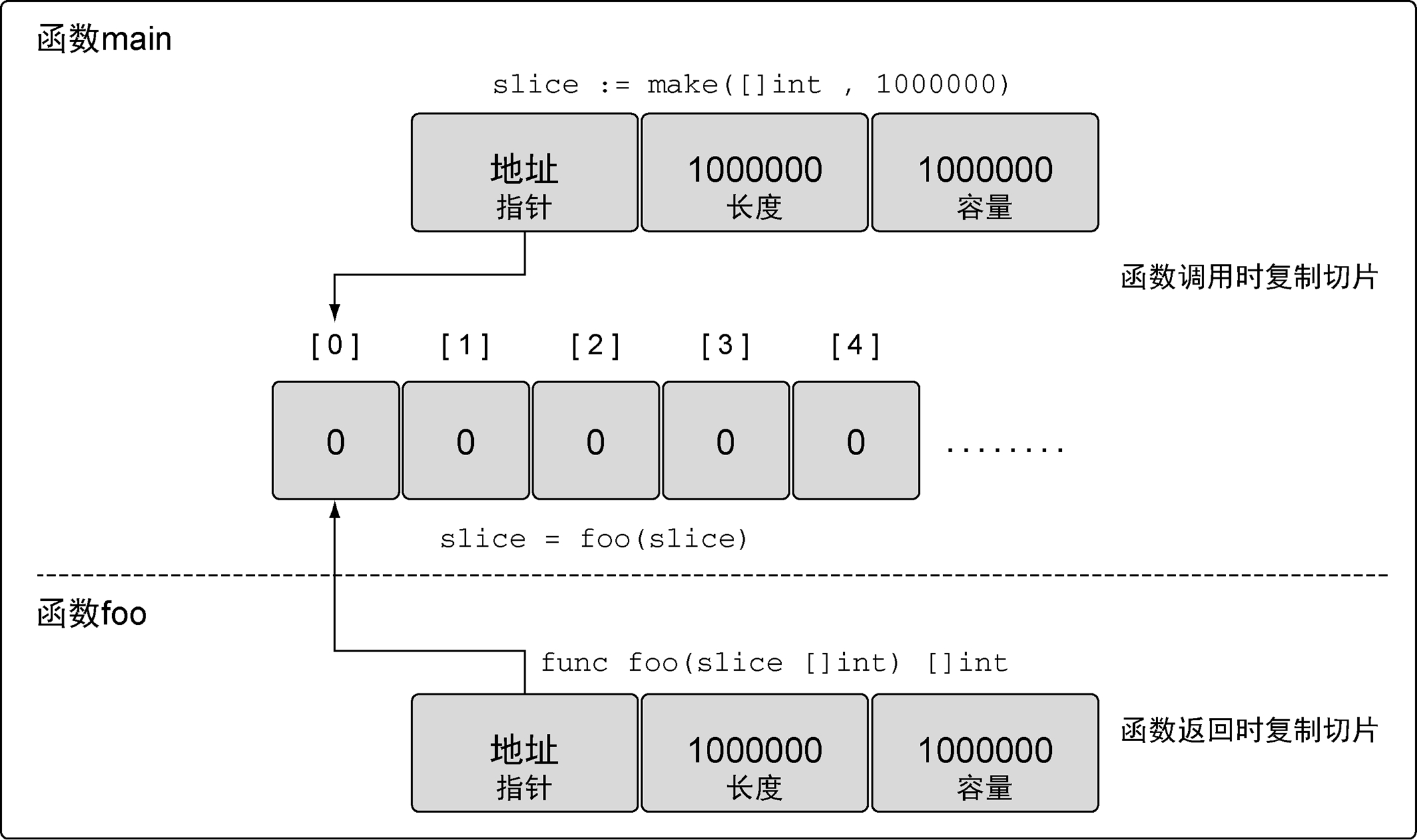 在函数间传递24字节的数据会非常快速、简单。这也是切片效率高的地方。不需要传递指针和处理复杂的语法,只需要复制切片,按想要的方式修改数据,然后传递回一份新的切片副本。