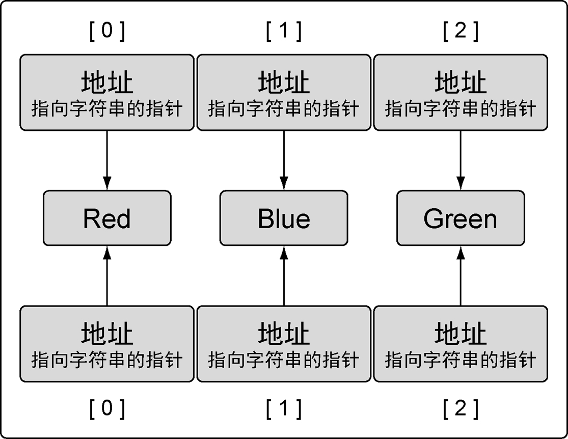 // 声明第二个包含3个元素的指向字符串的指针数组