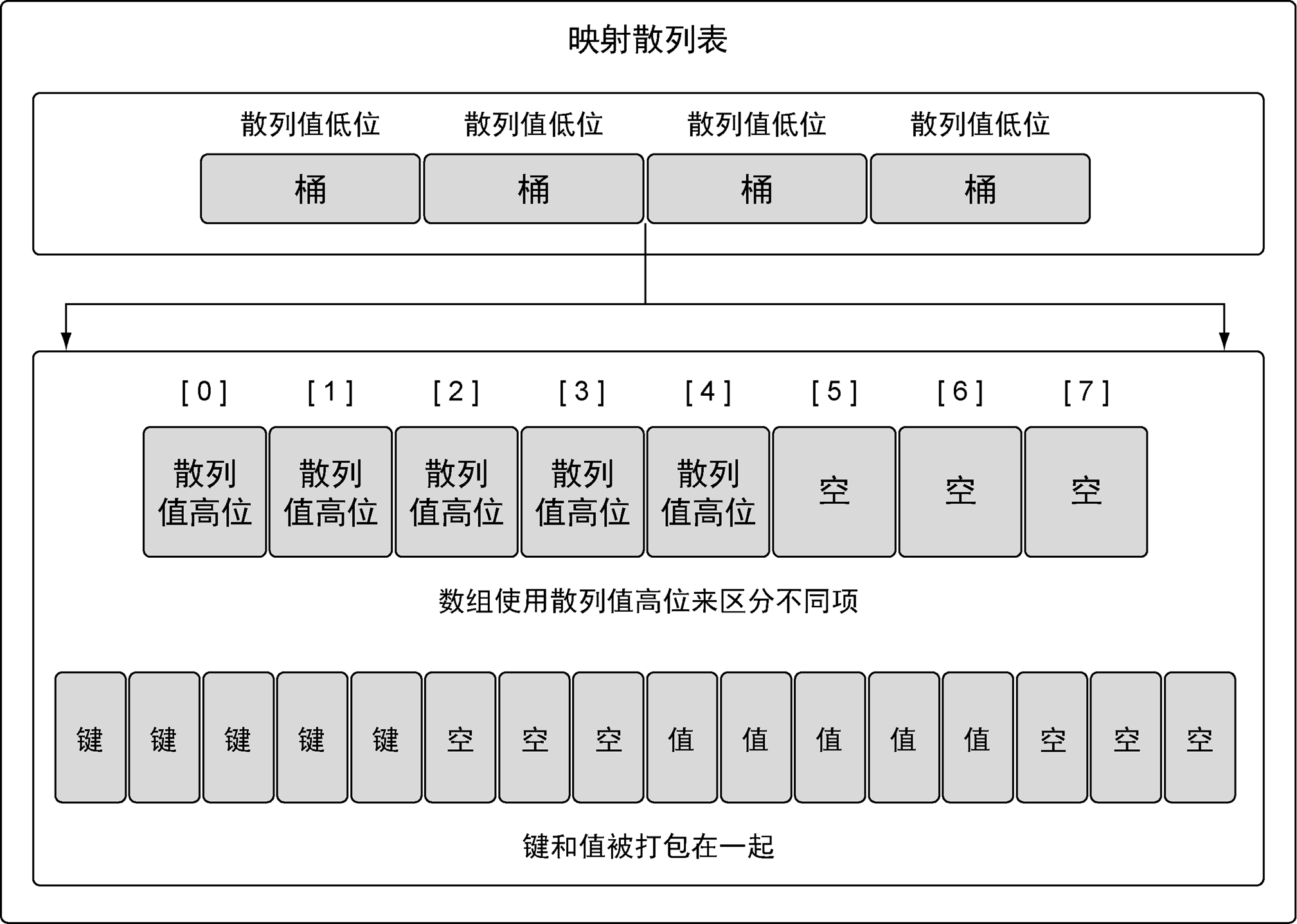如果再仔细看看图4-24,就能看出桶的内部实现。映射使用两个数据结构来存储数据。第一个数据结构是一个数组,内部存储的是用于选择桶的散列键的高八位值。这个数组用于区分每个键值对要存在哪个桶里。第二个数据结构是一个字节数组,用于存储键值对。该字节数组先依次存储了这个桶里所有的键,之后依次存储了这个桶里所有的值。实现这种键值对的存储方式目的在于减少每个桶所需的内存。