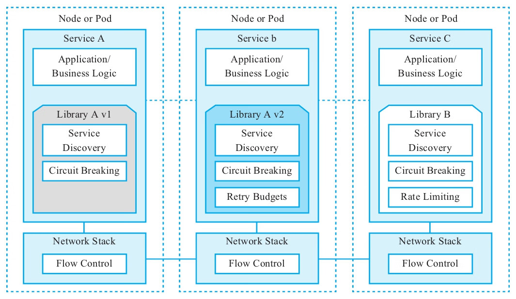 当我们将应用程序弹性能力的实现分散到应用程序本身时,显然减轻了对大规模服务架构的担忧,但同时也引入了一些新的挑战。譬如,如果我们希望在架构中引入新服务,它将受限于其他人和其他团队的实施决策。假设在架构中要使用Netf lixOSS Hystrix,则必须使用Java或某些基于JVM的技术。通常,熔断和负载均衡是一致的,因此需要使用这两个弹性库。若要使用Netf lix功能区进行负载均衡,可能还需要使用Eureka的服务注册库。