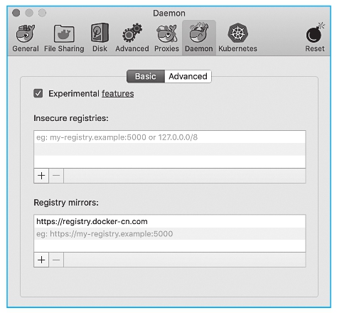 如果是在Mac上运行Docker Desktop,首先为Docker daemon配置Docker Hub的中国官方镜像加速:https://registry.docker-cn.com,如图2-4所示。