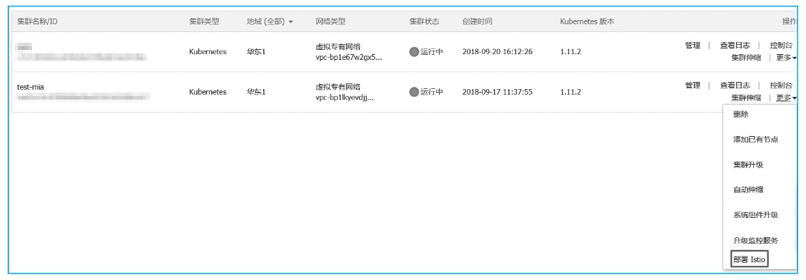 登录容器服务管理控制台,单击左侧导航栏中的集群,进入集群列表页面。选择所需的集群并单击操作列“更多>部署Istio”,如图2-11所示。