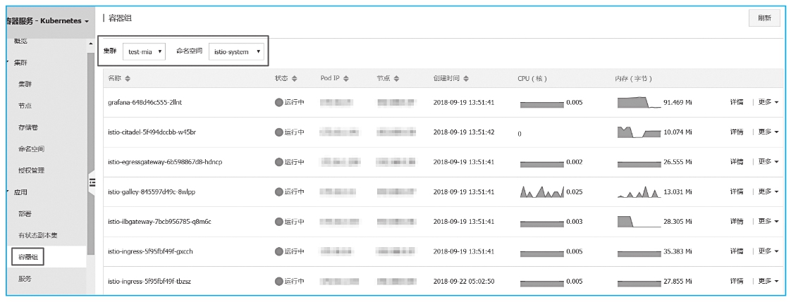 或者,单击左侧导航栏“应用>容器组”,进入容器组页面。选择部署Istio的集群及命名空间,可查看到已经部署Istio的相关容器组,如图2-16所示。