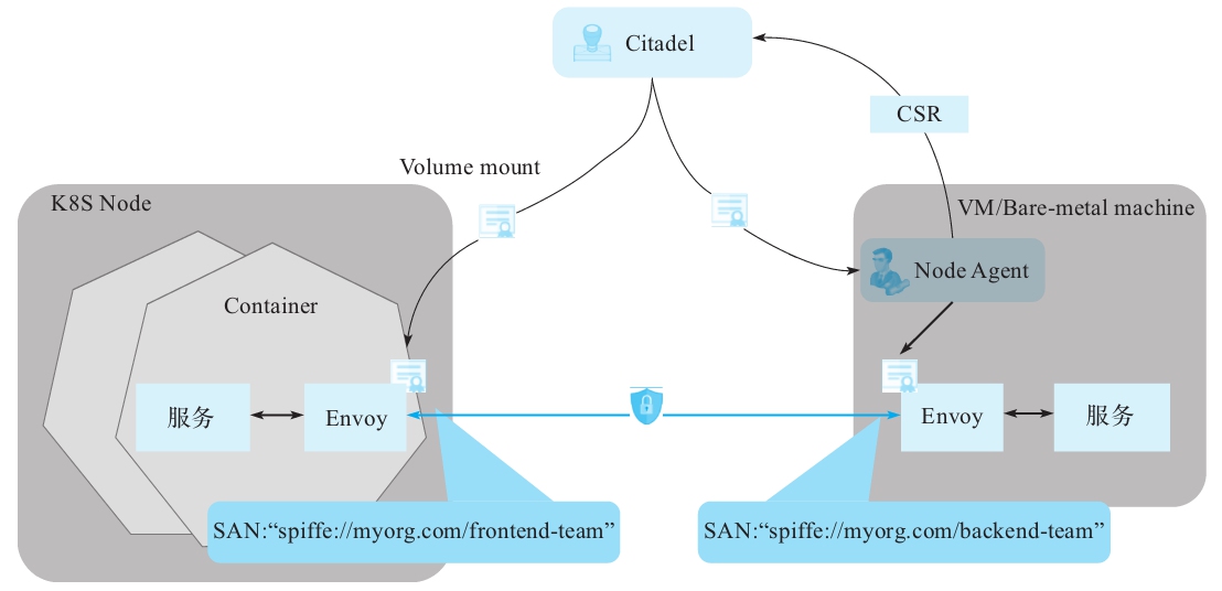 Istio Citadel安全功能提供强大的身份验证功能、强大的策略、透明的TLS加密以及用于保护服务和数据的身份验证、授权和审计(AAA)工具,Envoy可以终止或向网格中的服务发起TLS流量。为此,Citadel需要支持创建、签署和轮换证书。Istio Citadel提供特定于应用程序的证书,可用于建立双向TLS以保护服务之间的流量,如图3-4所示。