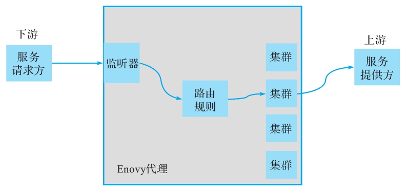 从图3-5可以看到上述其中几个术语与Envoy代理的关系。Envoy代理有许多功能可用于服务间通信,例如,暴露一个或者多个监听器给下游主机连接,通过端口暴露给外部的应用程序;通过定义路由规则处理监听器中传输的流量,并将该流量定向到目标集群,等等。后续章节会进一步分析这几个发现服务在Istio中的角色和作用。