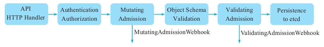 Admission是Kubernetes中的一个术语,指的是Kubernetes API Server资源请求过程中的一个阶段。如图3-8所示,在API Server接收到资源创建请求时,首先会对请求进行认证和鉴权,然后经过Admission处理,最后再保存到etcd。