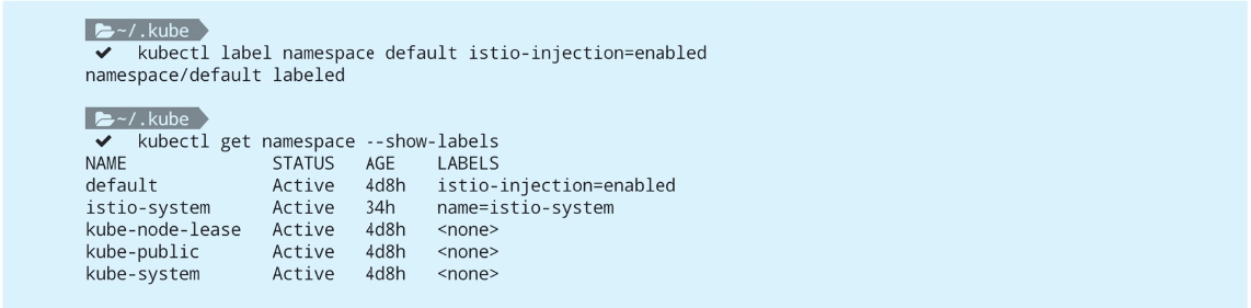通过使用kubectl为default命名空间打上标签istio-injection=enabled,执行结果如下所示: