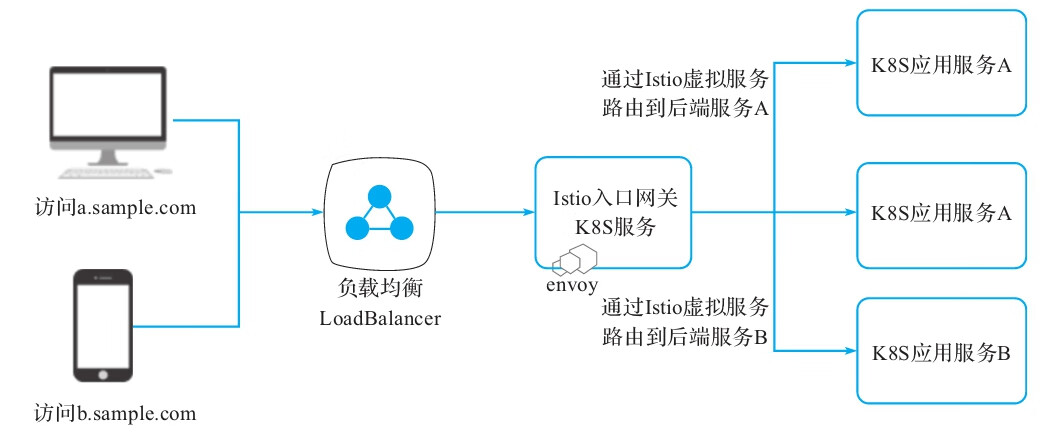 此外,Istio的网关还扮演负载均衡和虚拟主机路由的角色。如图5-3所示,可以看到默认情况下Istio使用Envoy代理作为入口代理。我们在前面的章节中看到,Envoy是一个功能强大的服务到服务代理,但它也有负载均衡和路由的功能,可代理的流量包括从服务网格外部到其内部运行的服务,或者从集群内部服务到外部服务。在前面章节中介绍的Envoy的所有功能也可以在入口网关中使用。