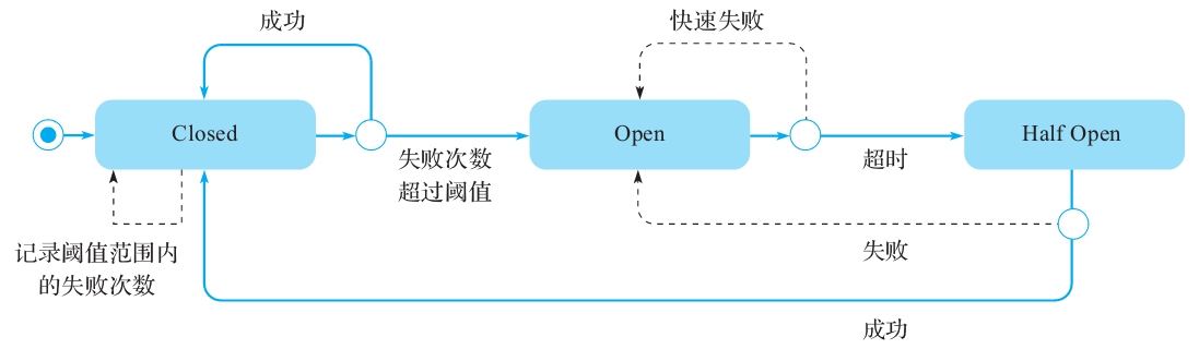 针对这些问题,Istio提供了一种非常实用且经过良好测试的熔断模式,实现了三个状态机:Closed、Half-Open、Open,如图6-3所示。