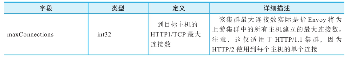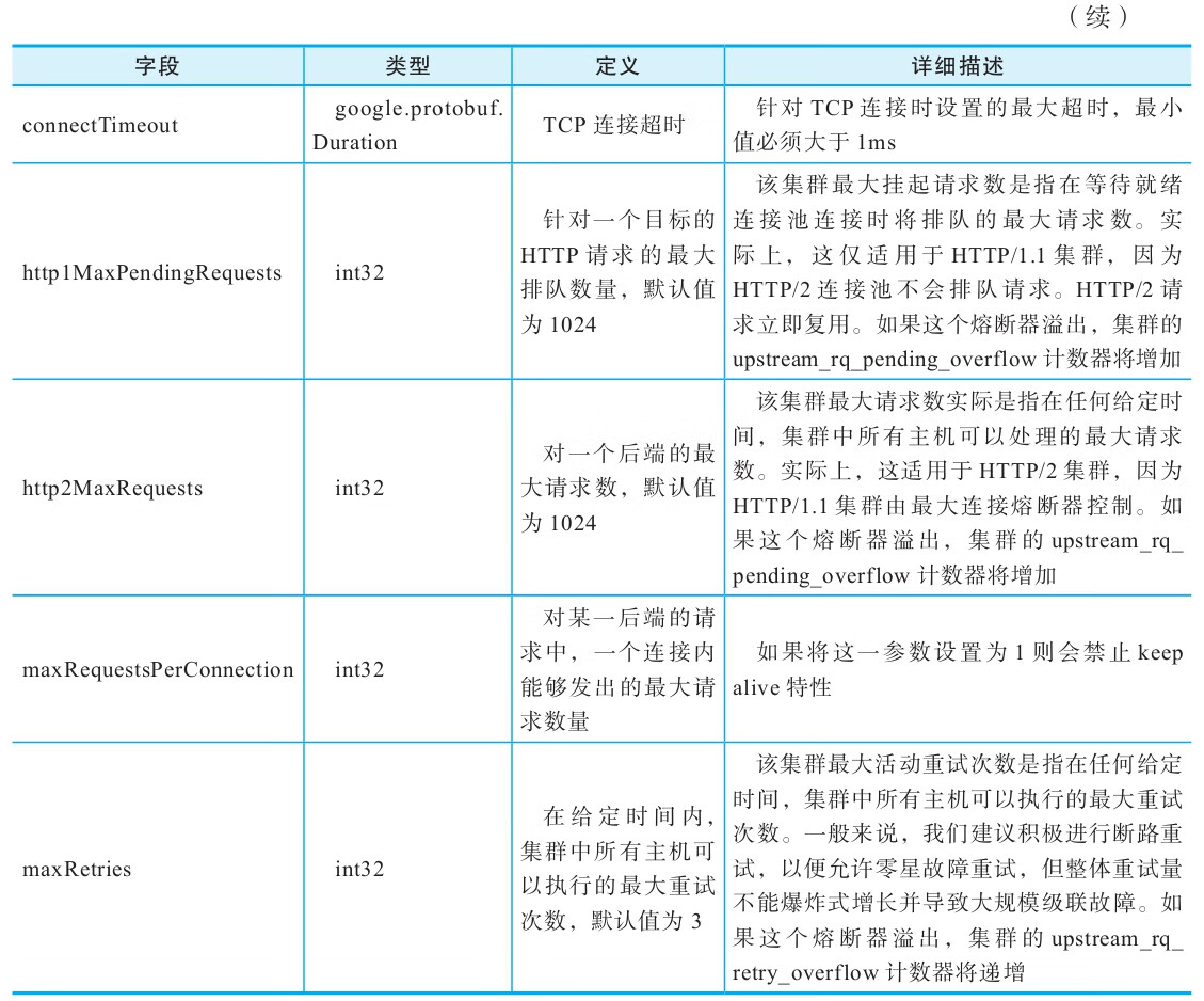 其中,Istio支持各种类型的熔断,通过连接池设置定义了上游主机的熔断信息,连接池设置参数参见表6-7。