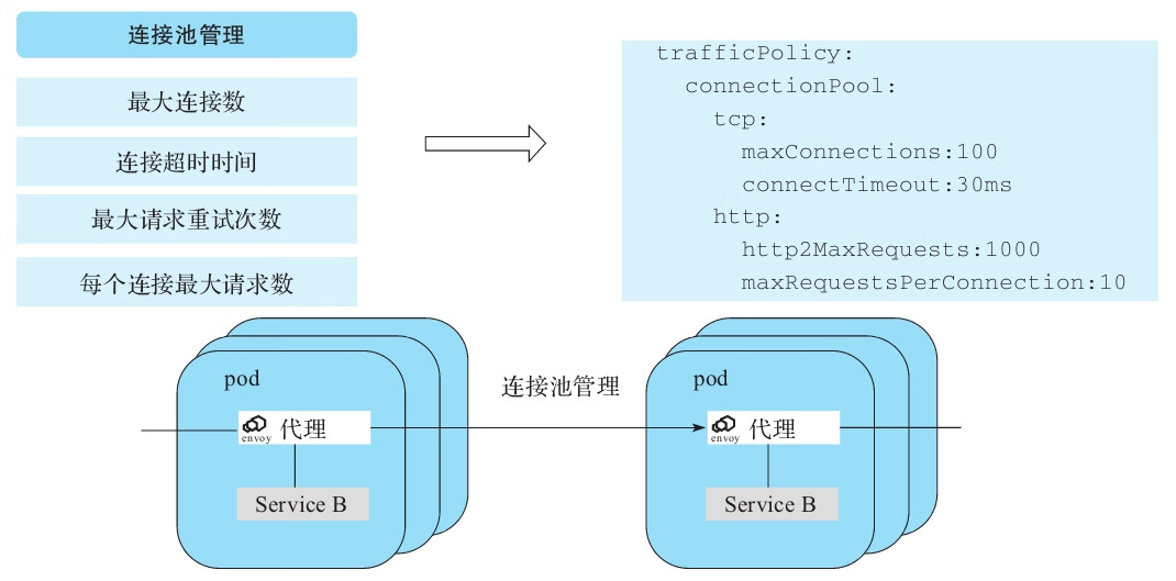 熔断是分布式系统的重要组成部分。快速失败并尽快给下游施加压力,几乎总是好的。这是Istio服务网格的主要优点之一,Istio采用连接池管理Envoy代理在网络级别实现强制断路限制,而不必独立配置和编写每个应用程序,如图6-4所示。