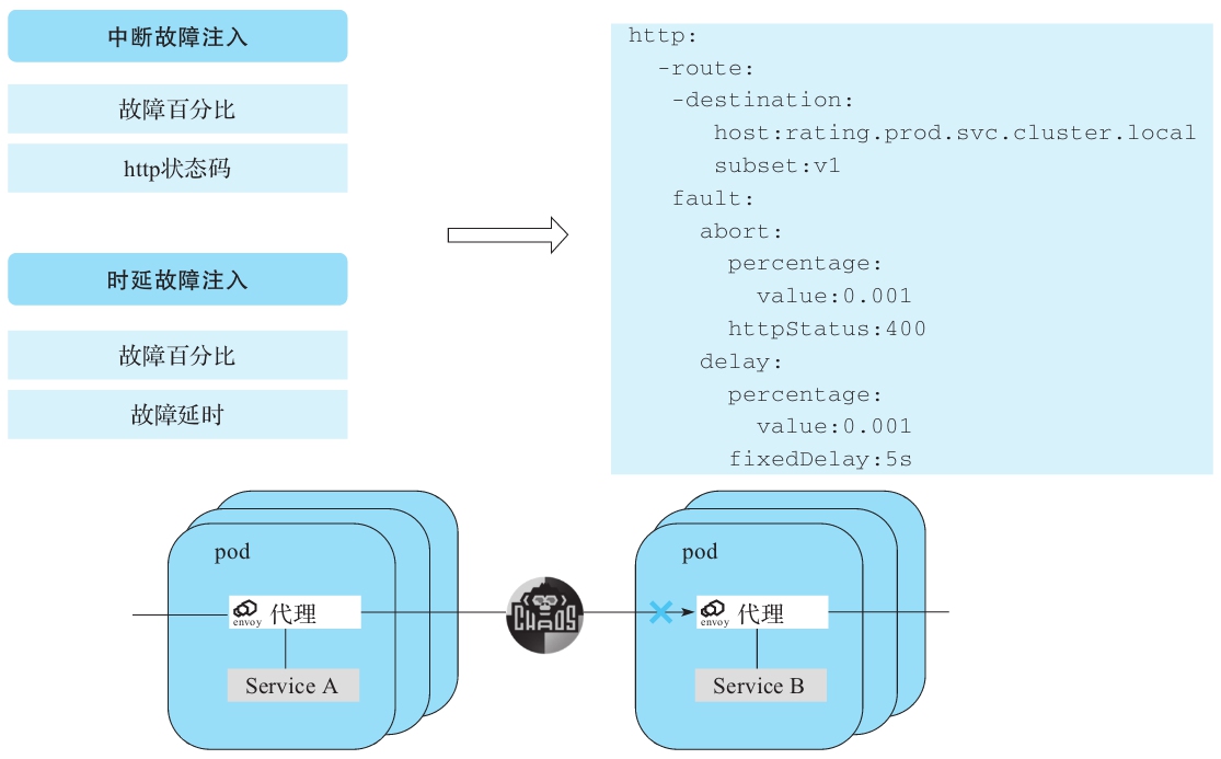 故障注入是混沌工程中经常用的一种手段。Istio可以支持2种故障注入方式(参见图6-6)。