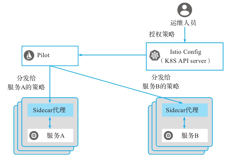 图7-5显示了Istio的授权架构,其中运维人员使用.yaml文件指定Istio授权策略。部署后,Istio将策略保存在Istio Conf ig Store中。Pilot监听Istio授权策略的变更,如果发现任何更改,它将获取更新后的授权策略。Pilot将Istio授权策略分发给与服务实例位于同一位置的Envoy代理。
