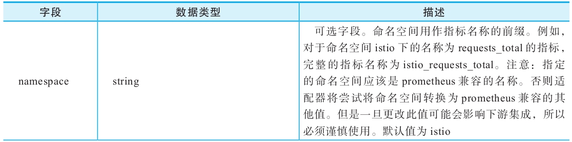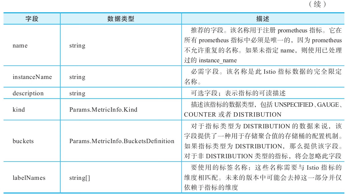 metrics:Params.MetricInfo[]类型,表示一组指标,如果在Istio中定义但在此处没有相应的定义,则不会在运行时填充它。表8-3描述了如何在Prometheus中表示具体的指标。