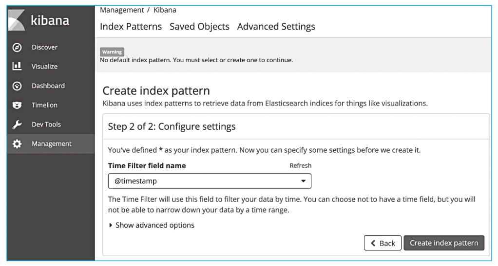 选择@timestamp作为时间过滤器字段名称,然后单击创建索引模式,如图8-9所示。