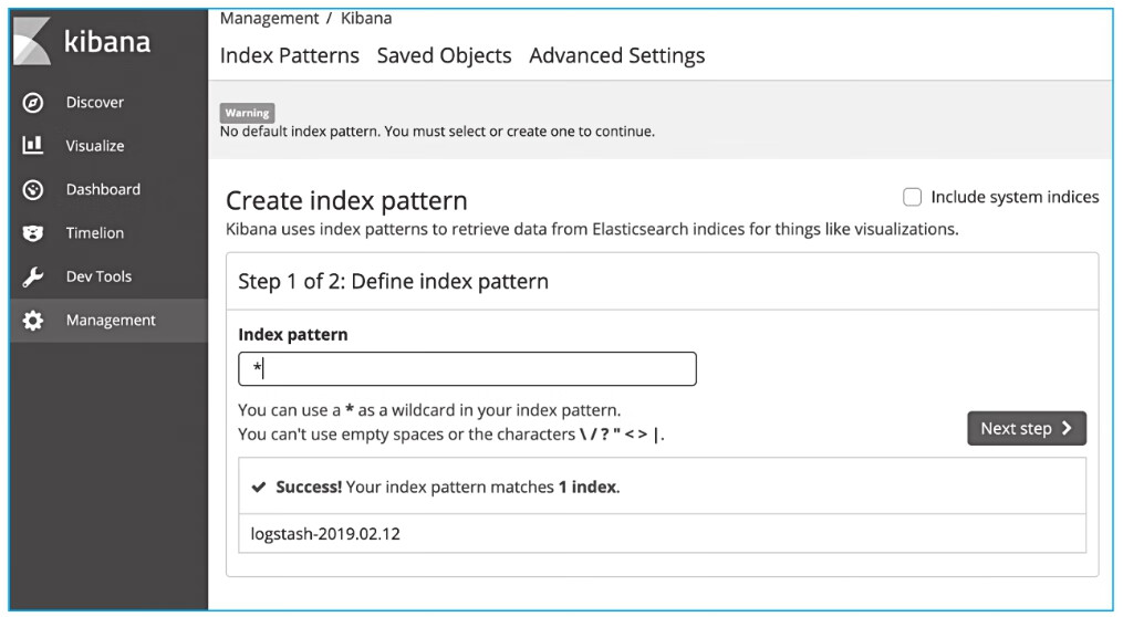 导航到KibanaUI并单击右上角的设置索引模式,使用“*”的指标类型,然后单击下一步,如图8-8所示。