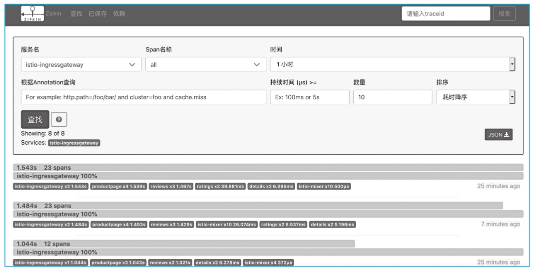 跟踪信息由一组Span组成,每个Span对应一个服务。这些服务在执行/productpage请求时被调用,除了应用服务之外,还包括Istio内部组件,例如istio-ingressgateway、istio-mixer、istio-policy等。