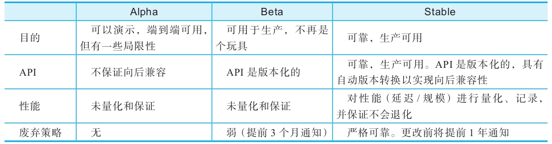 Istio社区一直在快速更新中,每个Istio功能模块的相对成熟度和支持级别也随之在不断地变化。社区对这些功能模块的不同发展阶段进行了定义,参见表9-1。