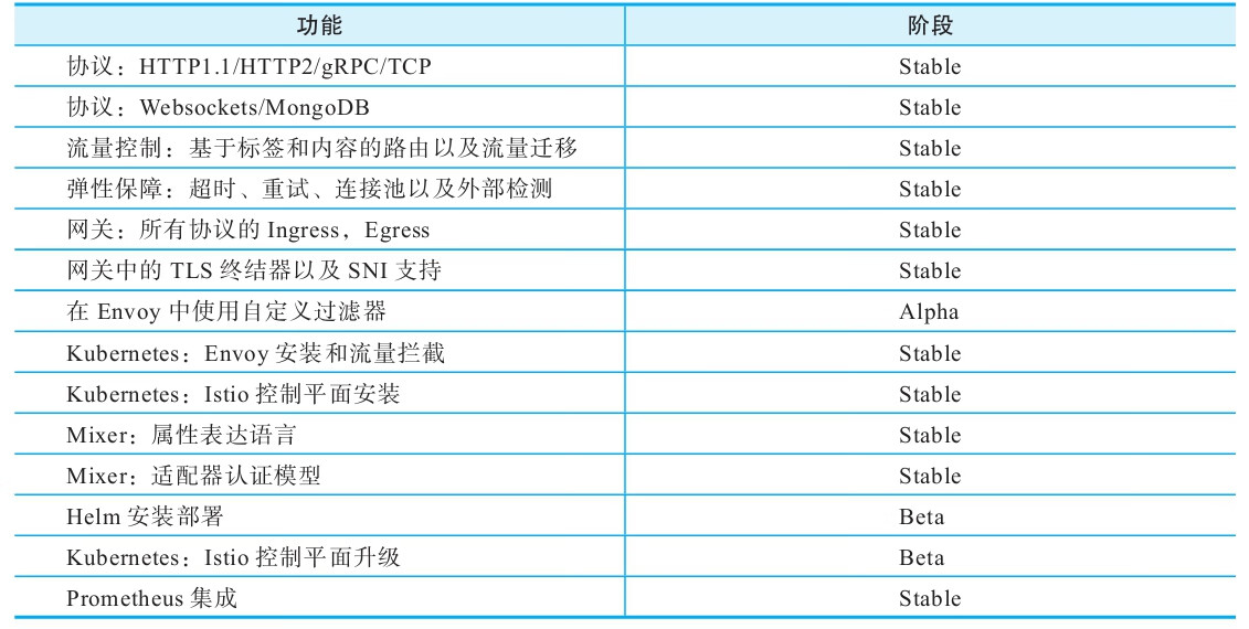 不同的功能模块成熟度和发展阶段不尽相同,熟悉这些阶段进展情况,对于选择Istio的哪些功能模块应用到生产环境中非常有帮助。这些信息在每月Istio发布后会及时更新,读者可以及时从官方网站了解最新进展:https://istio.io/about/feature-stages/。