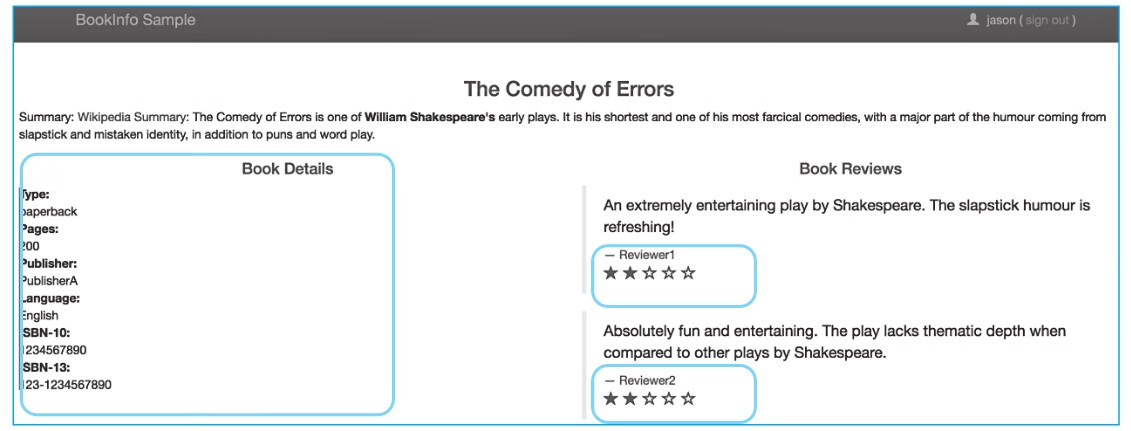 此时访问/productpage页面,效果如图10-8所示,details与ratings部分均能正常显示,而且这两个服务都是来自于ECS。从中可以更清晰地观察Bookinfo应用在输出方面的差异,评级记录值来自于数据库,所生成的评级显示与前面没有使用数据库的情况下生成的评级显示不同。