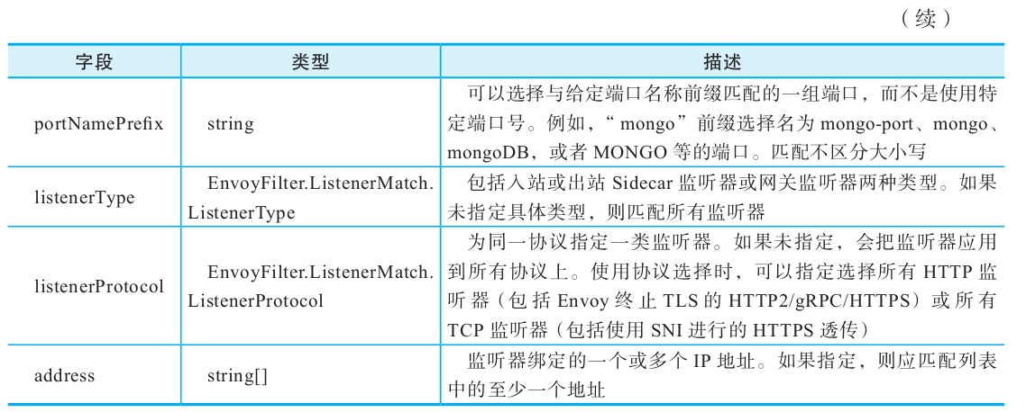 EnvoyFilter.ListenerMatch资源对象定义了如何选择一个监听器,在符合条件的情况下才会加入该过滤器配置,只有ListenerMatch中列出的所有条件全部符合(逻辑与)的情况下才能进行插入。具体定义如表10-4所示。