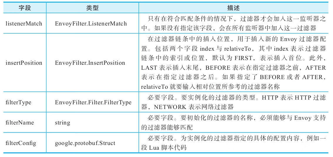 EnvoyFilter.Filter资源对象定义了要加入过滤器链条的Envoy过滤器的具体配置信息,定义如表10-3所示。