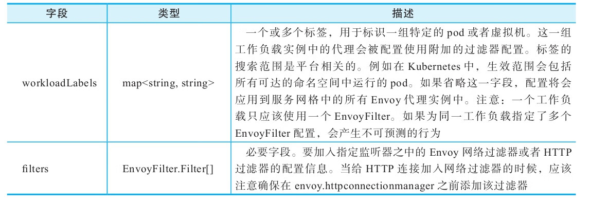 EnvoyFilter对象描述了针对代理服务的过滤器,可以通过workloadLabels字段限定针对哪些工作负载,通过f ilters字段指明过滤器配置信息。具体定义如表10-2所示。