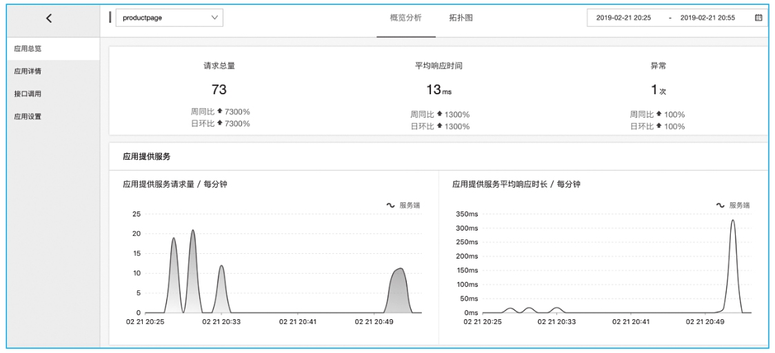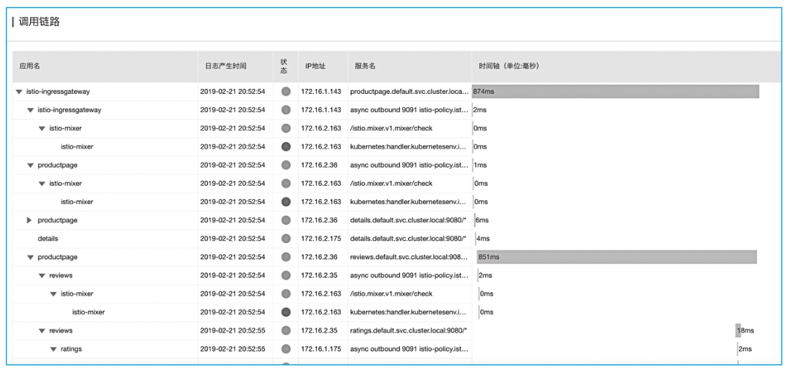 此外,只要是支持Zipkin接入协议的服务,Istio都可以很好地进行集成使用。当集成的外部服务是兼容Zipkin的服务(例如阿里云链路追踪服务)时,按照上述步骤部署之后就可以使用它的控制台查看跟踪数据。如图10-12所示,阿里云链路追踪服务的UI展示了收集的跟踪数据,体现了服务间的调用关系。