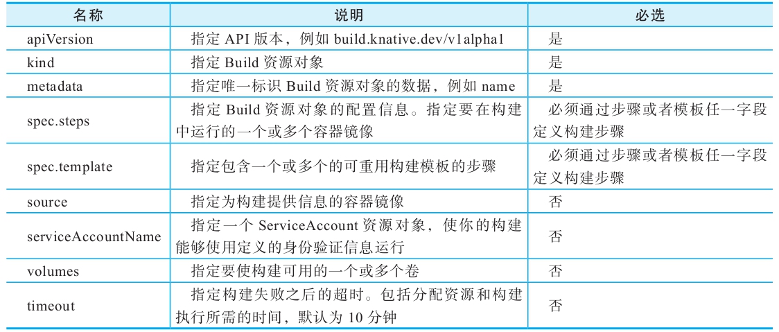 定义Build资源的配置文件可以指定的字段,如表11-1所示。