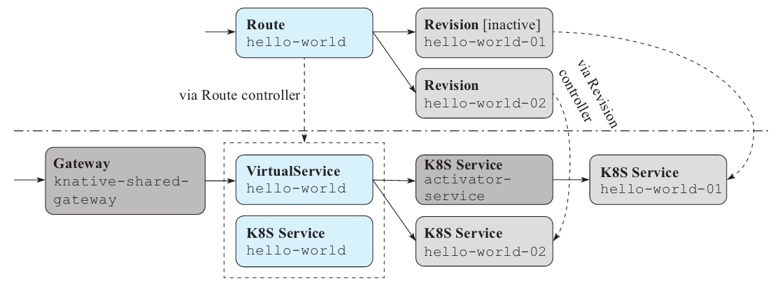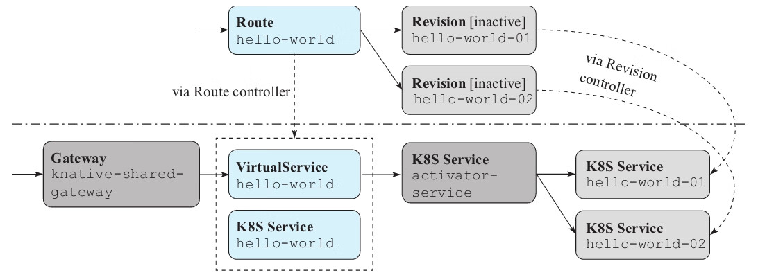 从上一个示例方案中,如果修订hello-world-01因缺少流量而变为非活动状态,则资源将如图11-7所示。