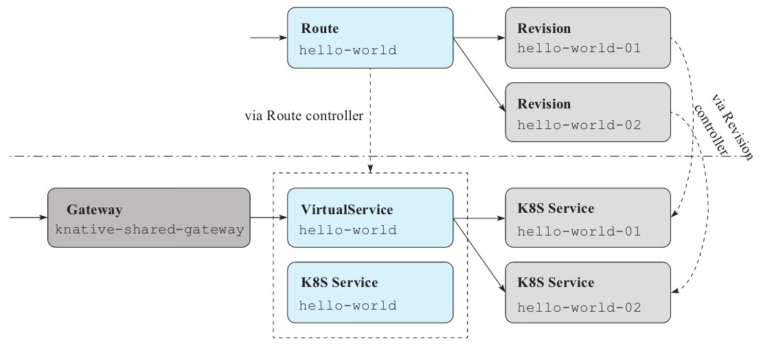 一个有效的Route对象在Knative Route控制器的协调下,将生成以下对象: