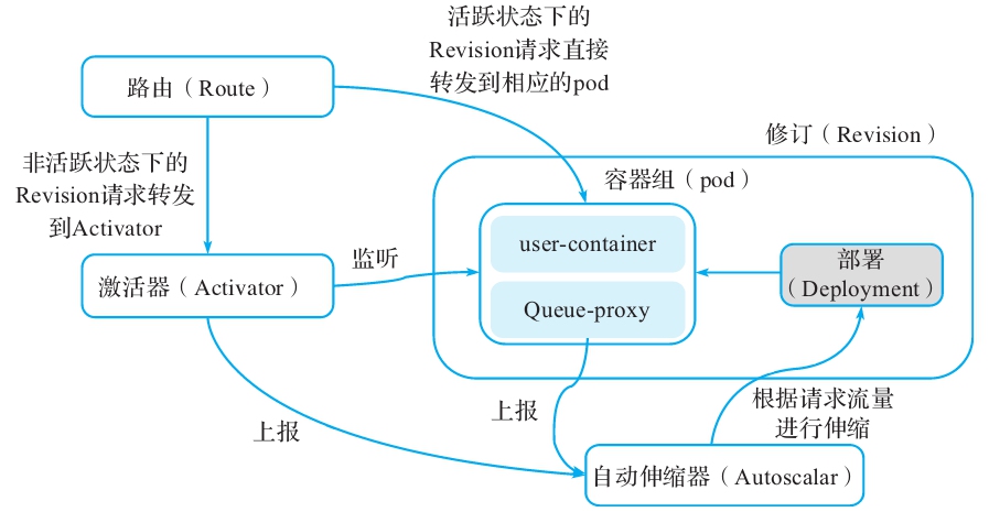 ·Knative Serving Activator:是指运行单个或多租户pod的Kubernetes部署(每个集群只有一个Activator,用于所有修订),它为没有pod的Revisions捕获请求。它通过Revision控制器调出运行用户代码的pod并转发捕获的请求。