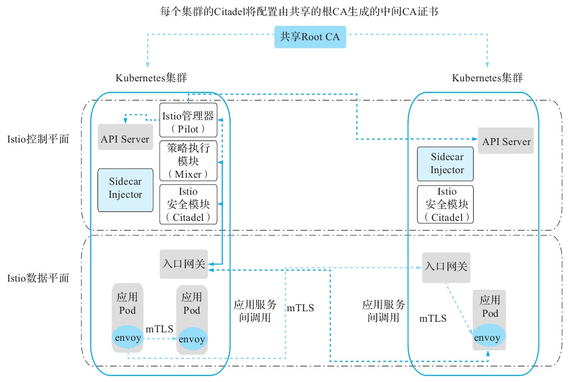 如图12-3所示,主集群cluster1运行全套的Istio控制平面组件,同时集群cluster2仅运行Istio Citadel、Sidecar Injector和Ingress网关。不需要VPN连接,不同集群中的工作负载之间也不需要直接网络访问。